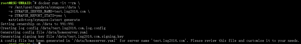 注意:在完成配置文件后,使用chown 99:100 /mnt/user/appdata/synapse -R 重写文件用户和组否则容器无法启动